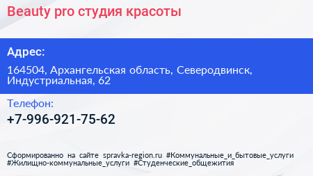 Beauty pro, студия красоты по адресу 164504, Архангельская область, Северодвинск, Индустриальная, 62 в дальнейшем Организация, размещена в следующих категориях: