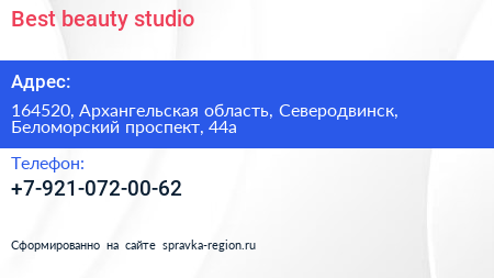 Best beauty studio по адресу 164520, Архангельская область, Северодвинск, Беломорский проспект, 44а в дальнейшем Организация, размещена в следующих категориях: