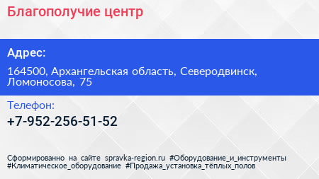 Благополучие, центр по адресу 164500, Архангельская область, Северодвинск, Ломоносова, 75 в дальнейшем Организация, размещена в следующих категориях: