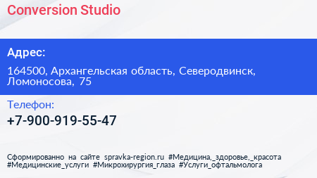 Conversion Studio по адресу 164500, Архангельская область, Северодвинск, Ломоносова, 75 в дальнейшем Организация, размещена в следующих категориях:
