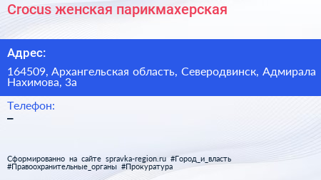 Crocus, женская парикмахерская по адресу 164509, Архангельская область, Северодвинск, Адмирала Нахимова, 3а в дальнейшем Организация, размещена в следующих категориях: