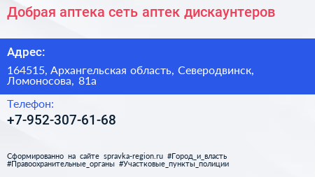 Добрая аптека, сеть аптек-дискаунтеров по адресу 164515, Архангельская область, Северодвинск, Ломоносова, 81а в дальнейшем Организация, размещена в следующих категориях: