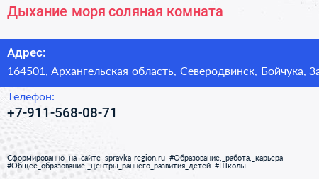 Дыхание моря, соляная комната по адресу 164501, Архангельская область, Северодвинск, Бойчука, 3а в дальнейшем Организация, размещена в следующих категориях: