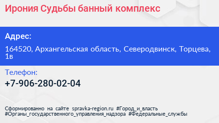 Ирония Судьбы, банный комплекс по адресу 164520, Архангельская область, Северодвинск, Торцева, 1в в дальнейшем Организация, размещена в следующих категориях: