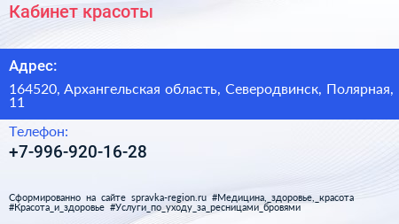 Кабинет красоты по адресу 164520, Архангельская область, Северодвинск, Полярная, 11 в дальнейшем Организация, размещена в следующих категориях: