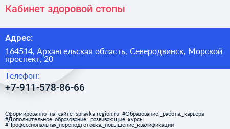 Кабинет здоровой стопы по адресу 164514, Архангельская область, Северодвинск, Морской проспект, 20 в дальнейшем Организация, размещена в следующих категориях: