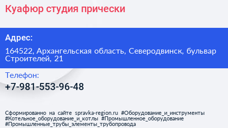 Куафюр, студия прически по адресу 164522, Архангельская область, Северодвинск, бульвар Строителей, 21 в дальнейшем Организация, размещена в следующих категориях: