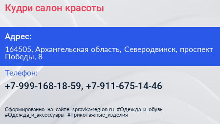 Кудри, салон красоты по адресу 164505, Архангельская область, Северодвинск, проспект Победы, 8 в дальнейшем Организация, размещена в следующих категориях: