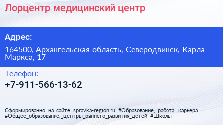 Лорцентр, медицинский центр по адресу 164500, Архангельская область, Северодвинск, Карла Маркса, 17 в дальнейшем Организация, размещена в следующих категориях: