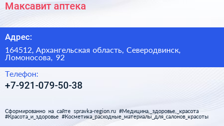 Максавит, аптека по адресу 164512, Архангельская область, Северодвинск, Ломоносова, 92 в дальнейшем Организация, размещена в следующих категориях: