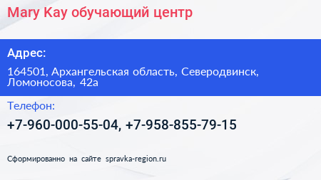 Mary Kay, обучающий центр по адресу 164501, Архангельская область, Северодвинск, Ломоносова, 42а в дальнейшем Организация, размещена в следующих категориях: