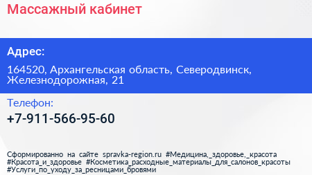Массажный кабинет по адресу 164520, Архангельская область, Северодвинск, Железнодорожная, 21 в дальнейшем Организация, размещена в следующих категориях: