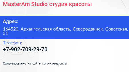 MasterAm Studio, студия красоты по адресу 164520, Архангельская область, Северодвинск, Советская, 31 в дальнейшем Организация, размещена в следующих категориях: