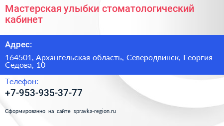 Мастерская улыбки, стоматологический кабинет по адресу 164501, Архангельская область, Северодвинск, Георгия Седова, 10 в дальнейшем Организация, размещена в следующих категориях: