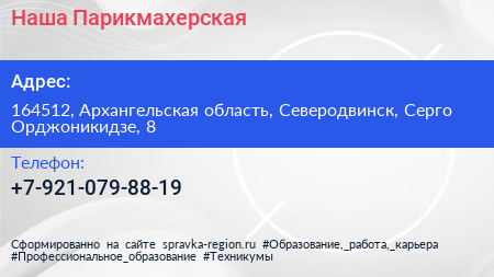 Наша Парикмахерская по адресу 164512, Архангельская область, Северодвинск, Серго Орджоникидзе, 8 в дальнейшем Организация, размещена в следующих категориях: