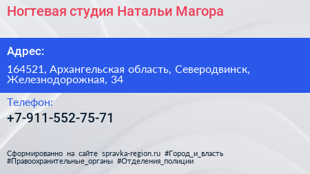 Ногтевая студия Натальи Магора по адресу 164521, Архангельская область, Северодвинск, Железнодорожная, 34 в дальнейшем Организация, размещена в следующих категориях: