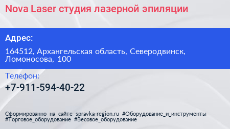 Nova Laser, студия лазерной эпиляции по адресу 164512, Архангельская область, Северодвинск, Ломоносова, 100 в дальнейшем Организация, размещена в следующих категориях: