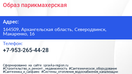Образ, парикмахерская по адресу 164509, Архангельская область, Северодвинск, Макаренко, 16 в дальнейшем Организация, размещена в следующих категориях:
