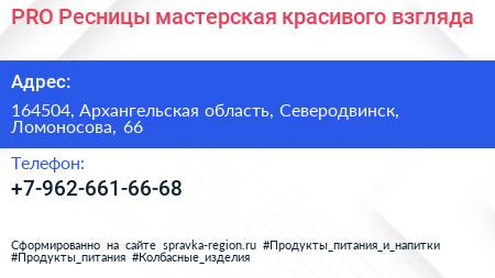 PRO Ресницы, мастерская красивого взгляда по адресу 164504, Архангельская область, Северодвинск, Ломоносова, 66 в дальнейшем Организация, размещена в следующих категориях: