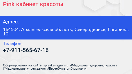 Pink, кабинет красоты по адресу 164504, Архангельская область, Северодвинск, Гагарина, 10 в дальнейшем Организация, размещена в следующих категориях: