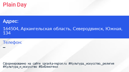 Plain Day по адресу 164504, Архангельская область, Северодвинск, Южная, 134 в дальнейшем Организация, размещена в следующих категориях: