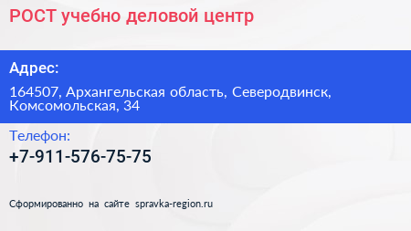 РОСТ, учебно-деловой центр по адресу 164507, Архангельская область, Северодвинск, Комсомольская, 34 в дальнейшем Организация, размещена в следующих категориях:
