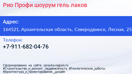 Рио Профи, шоурум гель-лаков по адресу 164521, Архангельская область, Северодвинск, Лесная, 25 в дальнейшем Организация, размещена в следующих категориях: