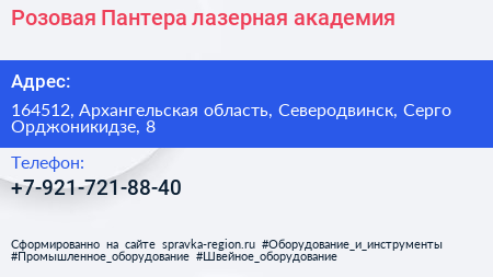 Розовая Пантера, лазерная академия по адресу 164512, Архангельская область, Северодвинск, Серго Орджоникидзе, 8 в дальнейшем Организация, размещена в следующих категориях: