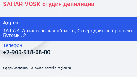 SAHAR & VOSK, студия депиляции по адресу 164524, Архангельская область, Северодвинск, проспект Бутомы, 2 в дальнейшем Организация, размещена в следующих категориях: