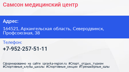 Самсон, медицинский центр по адресу 164521, Архангельская область, Северодвинск, Профсоюзная, 38 в дальнейшем Организация, размещена в следующих категориях: