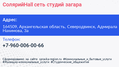 СолярийHall, сеть студий загара по адресу 164509, Архангельская область, Северодвинск, Адмирала Нахимова, 3а в дальнейшем Организация, размещена в следующих категориях: