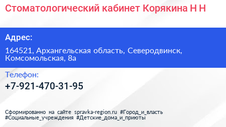 Стоматологический кабинет Корякина Н.Н. по адресу 164521, Архангельская область, Северодвинск, Комсомольская, 8а в дальнейшем Организация, размещена в следующих категориях: