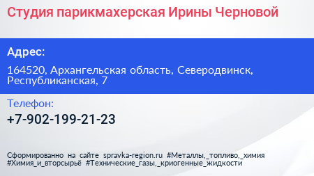 Студия-парикмахерская Ирины Черновой по адресу 164520, Архангельская область, Северодвинск, Республиканская, 7 в дальнейшем Организация, размещена в следующих категориях: