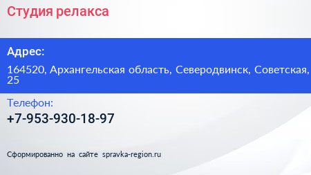 Студия релакса по адресу 164520, Архангельская область, Северодвинск, Советская, 25 в дальнейшем Организация, размещена в следующих категориях: