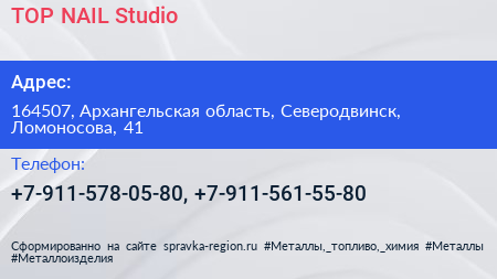 TOP NAIL Studio по адресу 164507, Архангельская область, Северодвинск, Ломоносова, 41 в дальнейшем Организация, размещена в следующих категориях:
