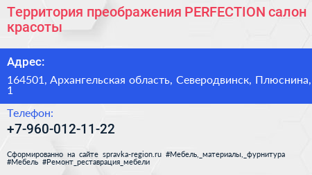Территория преображения PERFECTION, салон красоты по адресу 164501, Архангельская область, Северодвинск, Плюснина, 1 в дальнейшем Организация, размещена в следующих категориях: