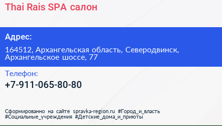 Thai Rais, SPA-салон по адресу 164512, Архангельская область, Северодвинск, Архангельское шоссе, 77 в дальнейшем Организация, размещена в следующих категориях: