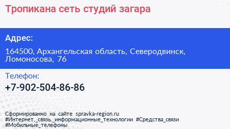 Тропикана, сеть студий загара по адресу 164500, Архангельская область, Северодвинск, Ломоносова, 76 в дальнейшем Организация, размещена в следующих категориях: