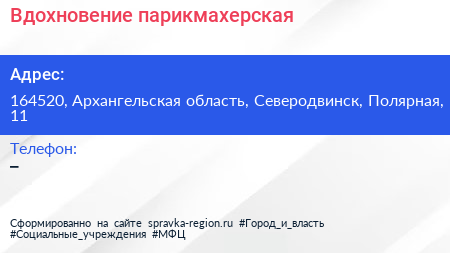 Вдохновение, парикмахерская по адресу 164520, Архангельская область, Северодвинск, Полярная, 11 в дальнейшем Организация, размещена в следующих категориях: