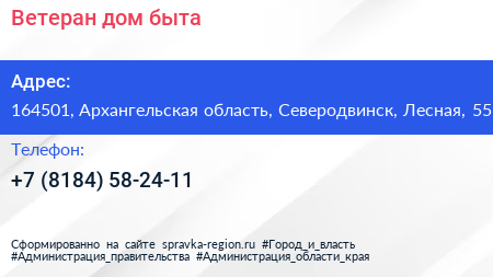 Ветеран, дом быта по адресу 164501, Архангельская область, Северодвинск, Лесная, 55 в дальнейшем Организация, размещена в следующих категориях: