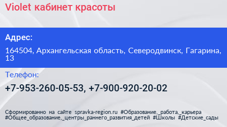 Violet, кабинет красоты по адресу 164504, Архангельская область, Северодвинск, Гагарина, 13 в дальнейшем Организация, размещена в следующих категориях:
