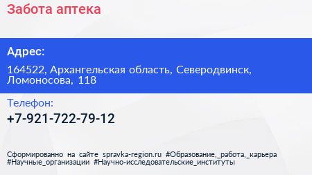 Забота, аптека по адресу 164522, Архангельская область, Северодвинск, Ломоносова, 118 в дальнейшем Организация, размещена в следующих категориях: