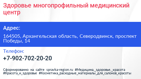 Здоровье, многопрофильный медицинский центр по адресу 164505, Архангельская область, Северодвинск, проспект Победы, 14 в дальнейшем Организация, размещена в следующих категориях:
