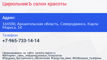 ЦирюльникЪ, салон красоты по адресу 164500, Архангельская область, Северодвинск, Карла Маркса, 14 в дальнейшем Организация, размещена в следующих категориях: