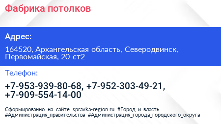 Фабрика потолков по адресу 164520, Архангельская область, Северодвинск, Первомайская, 20 ст2 в дальнейшем Организация, размещена в следующих категориях: