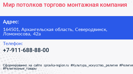 Мир потолков, торгово-монтажная компания по адресу 164501, Архангельская область, Северодвинск, Ломоносова, 42а в дальнейшем Организация, размещена в следующих категориях: