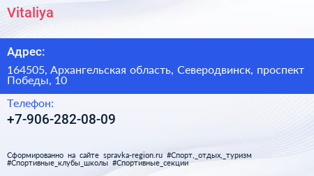Vitaliya по адресу 164505, Архангельская область, Северодвинск, проспект Победы, 10 в дальнейшем Организация, размещена в следующих категориях: