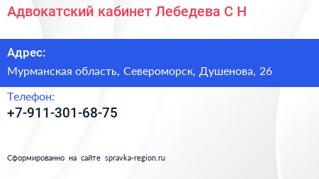 Адвокатский кабинет Лебедева С.Н. по адресу Мурманская область, Североморск, Душенова, 26 в дальнейшем Организация, размещена в следующих категориях: