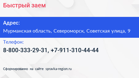 Быстрый заем по адресу Мурманская область, Североморск, Советская улица, 9 в дальнейшем Организация, размещена в следующих категориях: