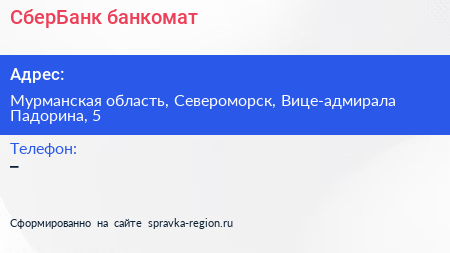 СберБанк, банкомат по адресу Мурманская область, Североморск, Вице-адмирала Падорина, 5 в дальнейшем Организация, размещена в следующих категориях: